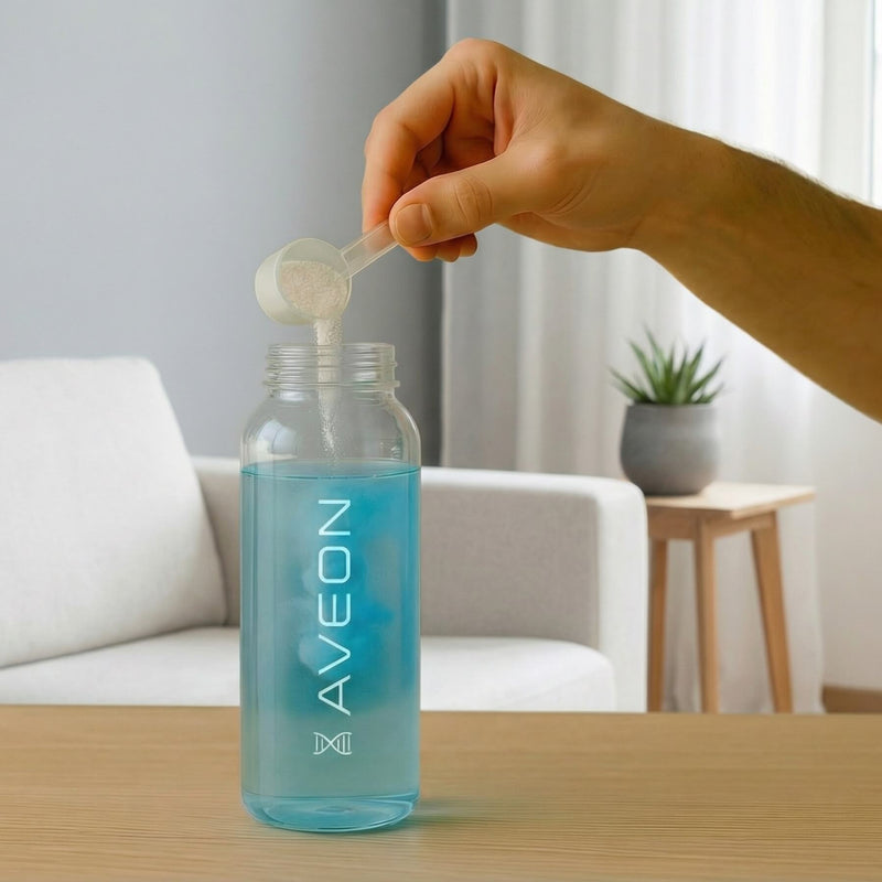 Mix one scoop (10g) in your Aveon bottle filled with cold water. Stir well until fully dissolved to reveal its sky blue color.
