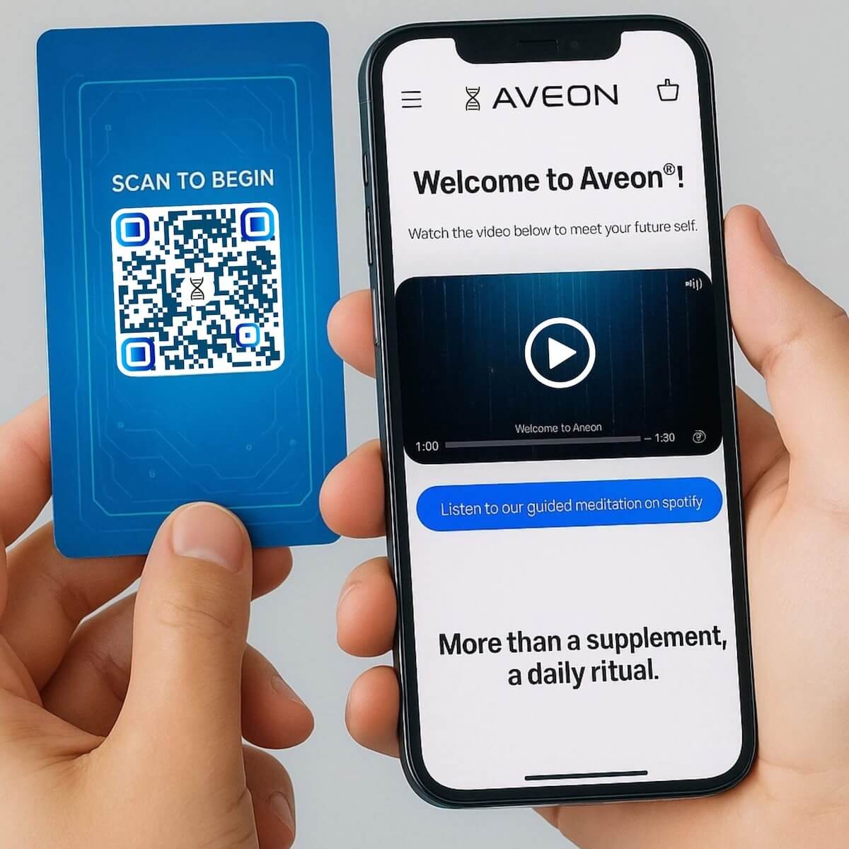 Inside every Aveon package, you’ll find a holographic activation card. After taking your first 3 sips, scan it to unlock a 10-min meditation designed specifically to accompany the drink. This is where physical and mental synergy begins: as your body absorbs the nutrients, your mind enters a state of presence, gratitude, and clarity.