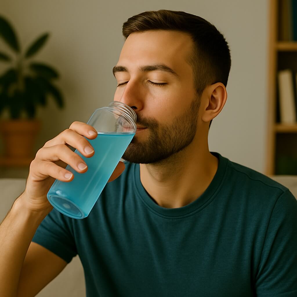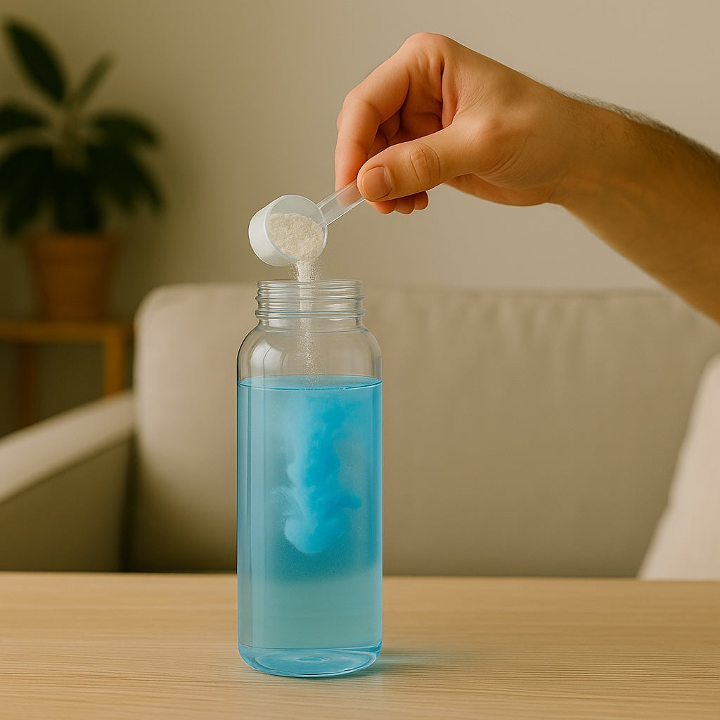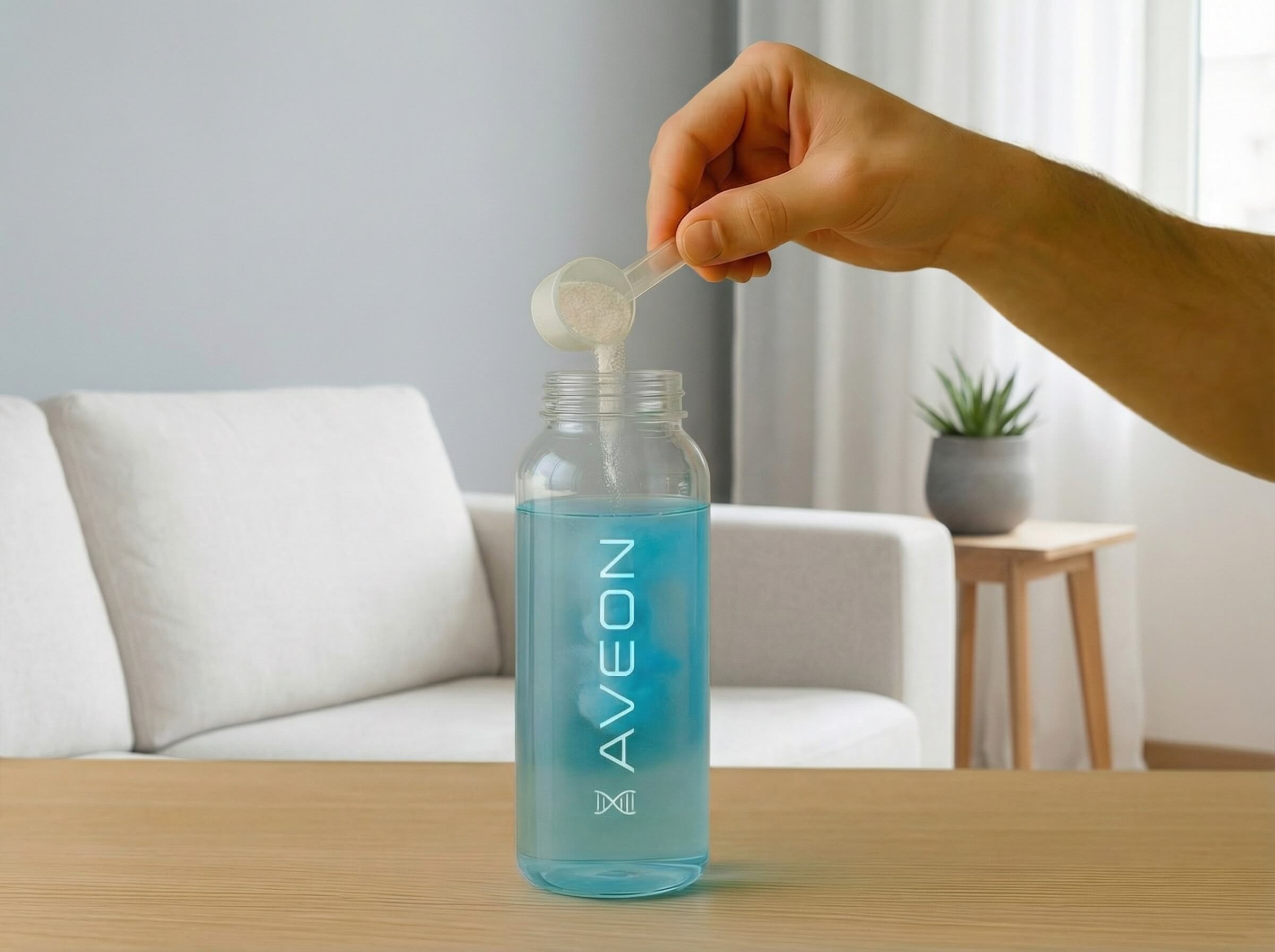Begin your journey by adding one scoop (10g) of Aveon Blue® into your Aveon bottle filled with cold water. Shake until the vibrant blue elixir is fully dissolved — a visual cue that your activation formula is ready.